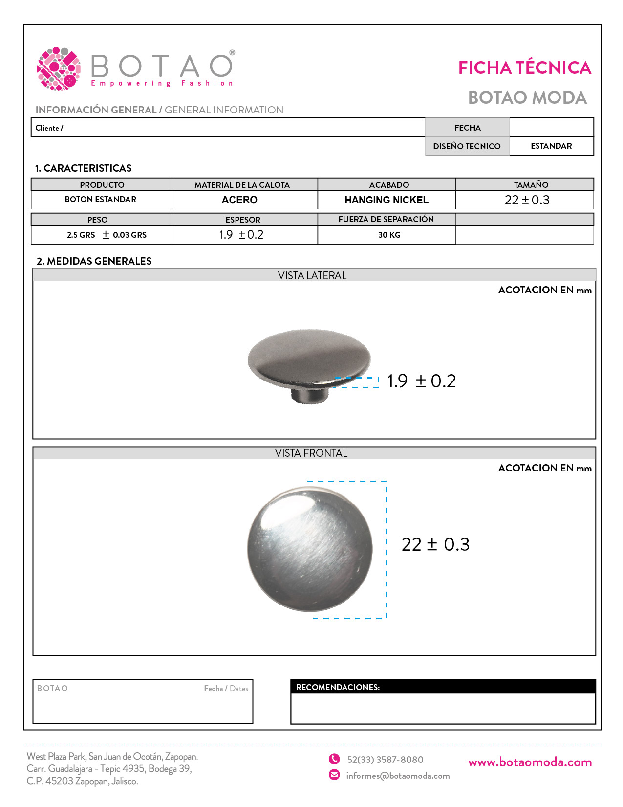 Botón Liso Estándar 22 mm Acero Hanging Niquel