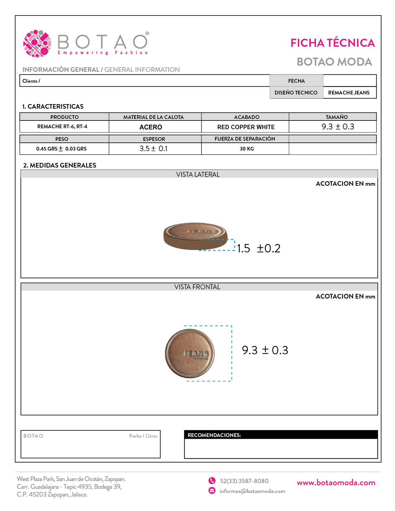 Remache Jeans Red Copper White RT6 9.3 mm y RT4 8 mm