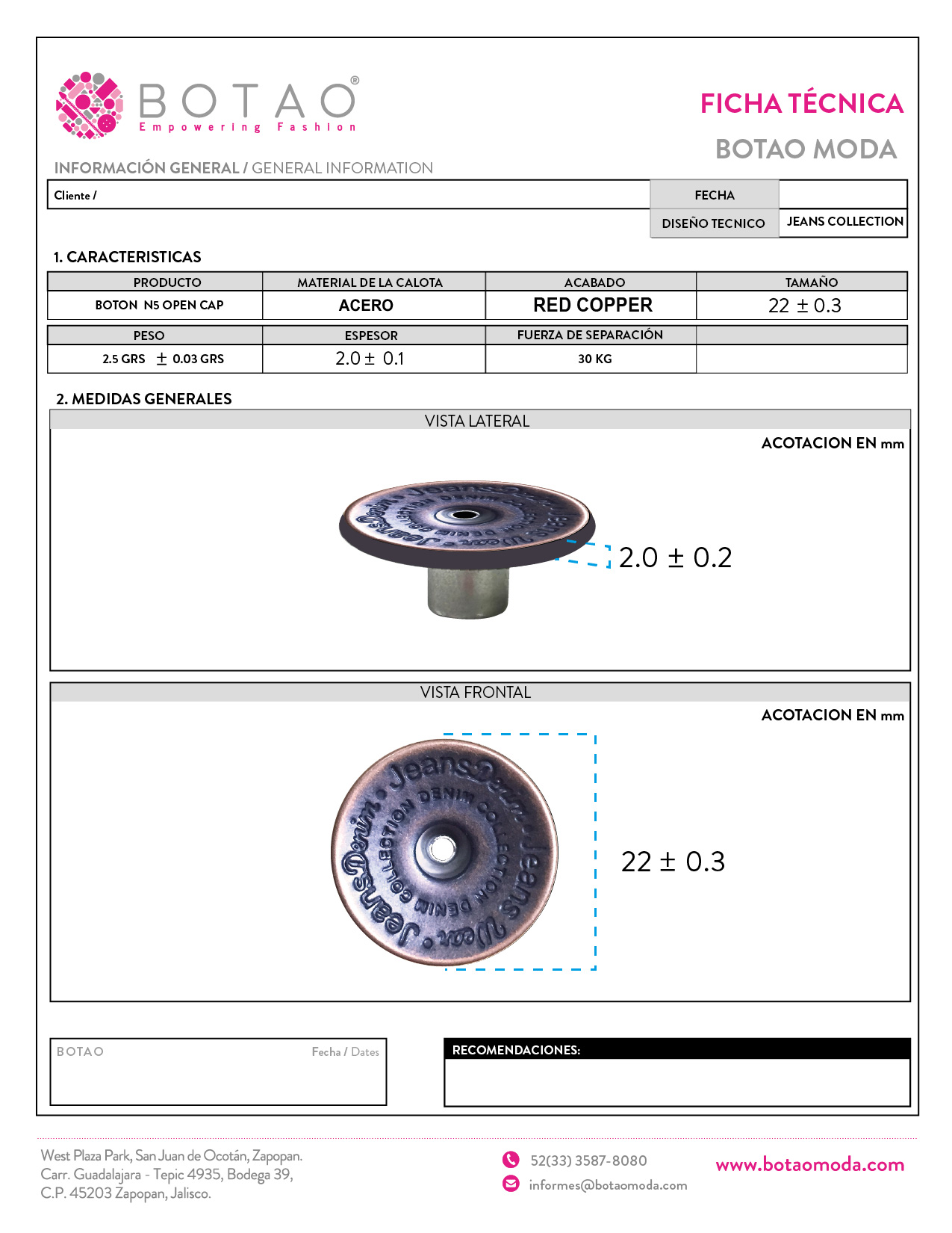 Botón JEANS COLLECTION OPEN CAP Acero Red Copper 22mm