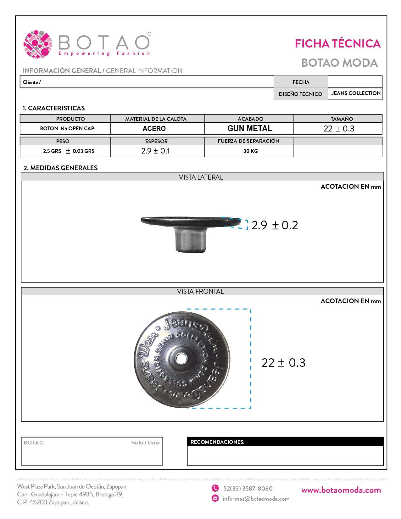 Botón Open cap JEANS WEAR Acero Gun Metal 22mm