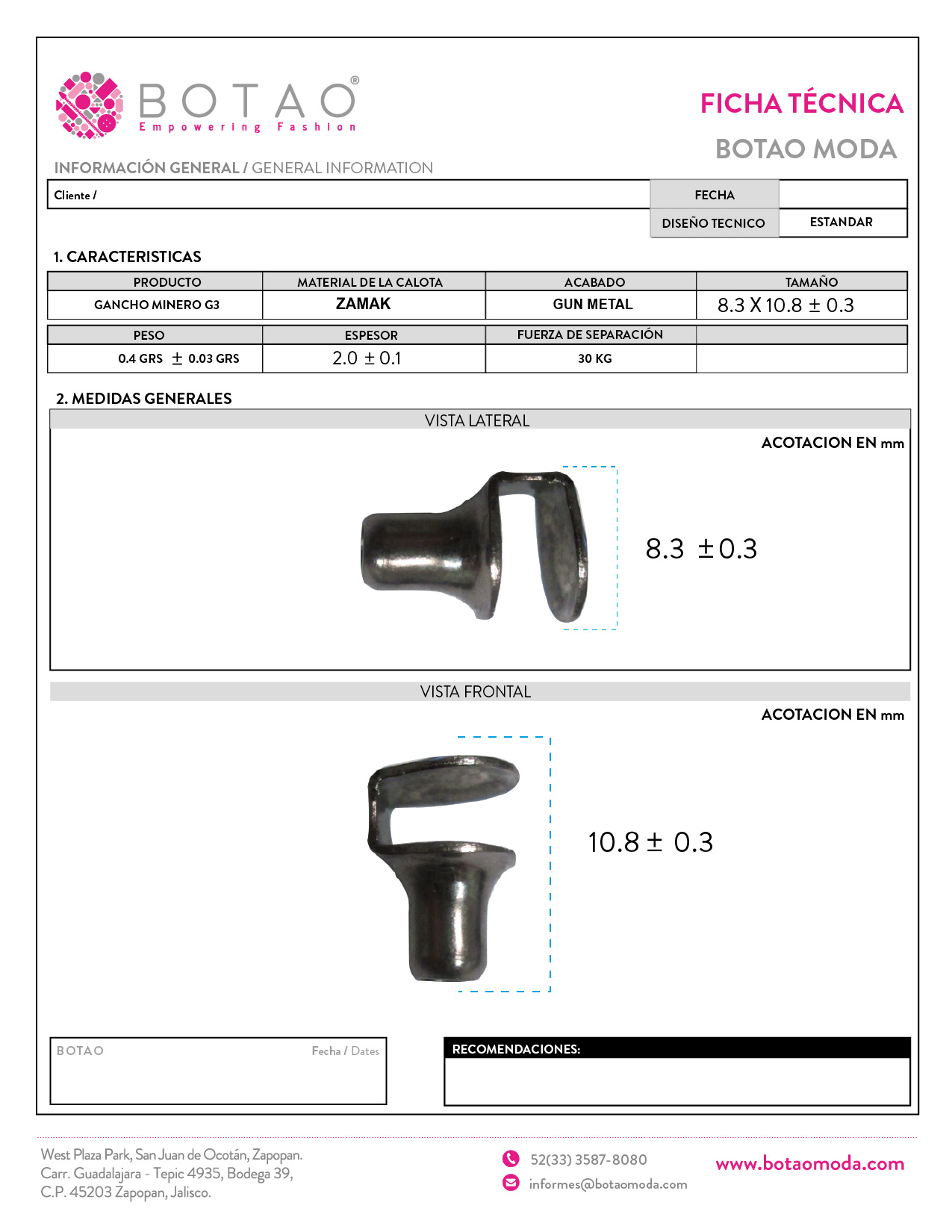 Gancho Minero G3 Gun Metal 8.3x10.8 mm Zamack