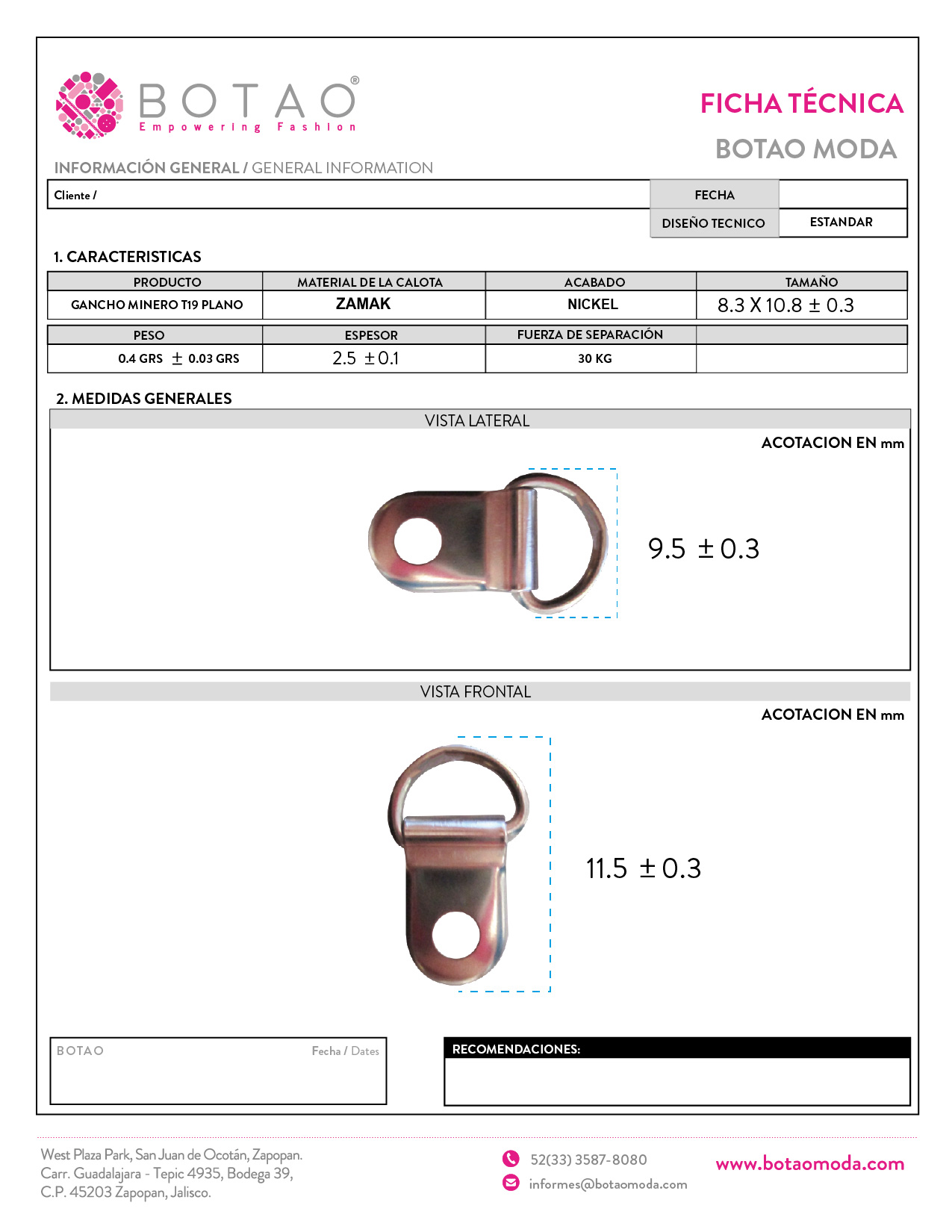Gancho Minero T19 Plano Nickel 9.5x11.5 mm Zamack